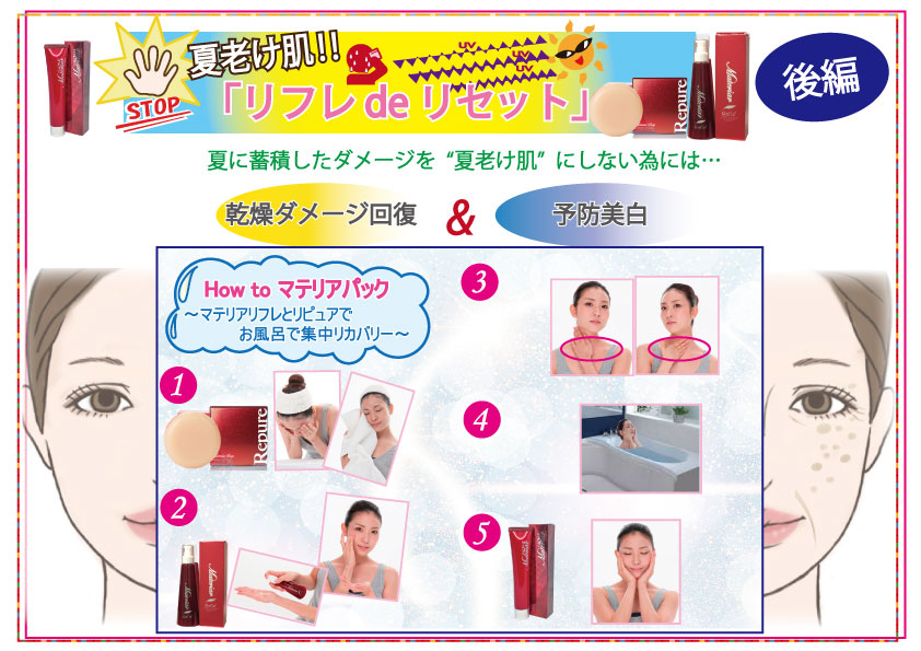 そこで弊社がおススメするのが、マテリアソープリピュアでの洗顔とマテリアリフレのパック、そしてEVクリームでの“追いチャージ”&保湿です。